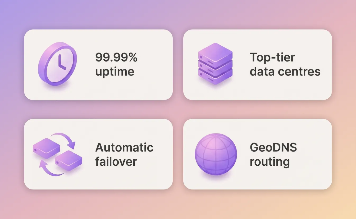 Your stream connects to a high-availability cluster, not a single server. We route you to the closest healthy region, and if a node falters, traffic instantly shifts to a healthy backup so your connection stays fast & stable.